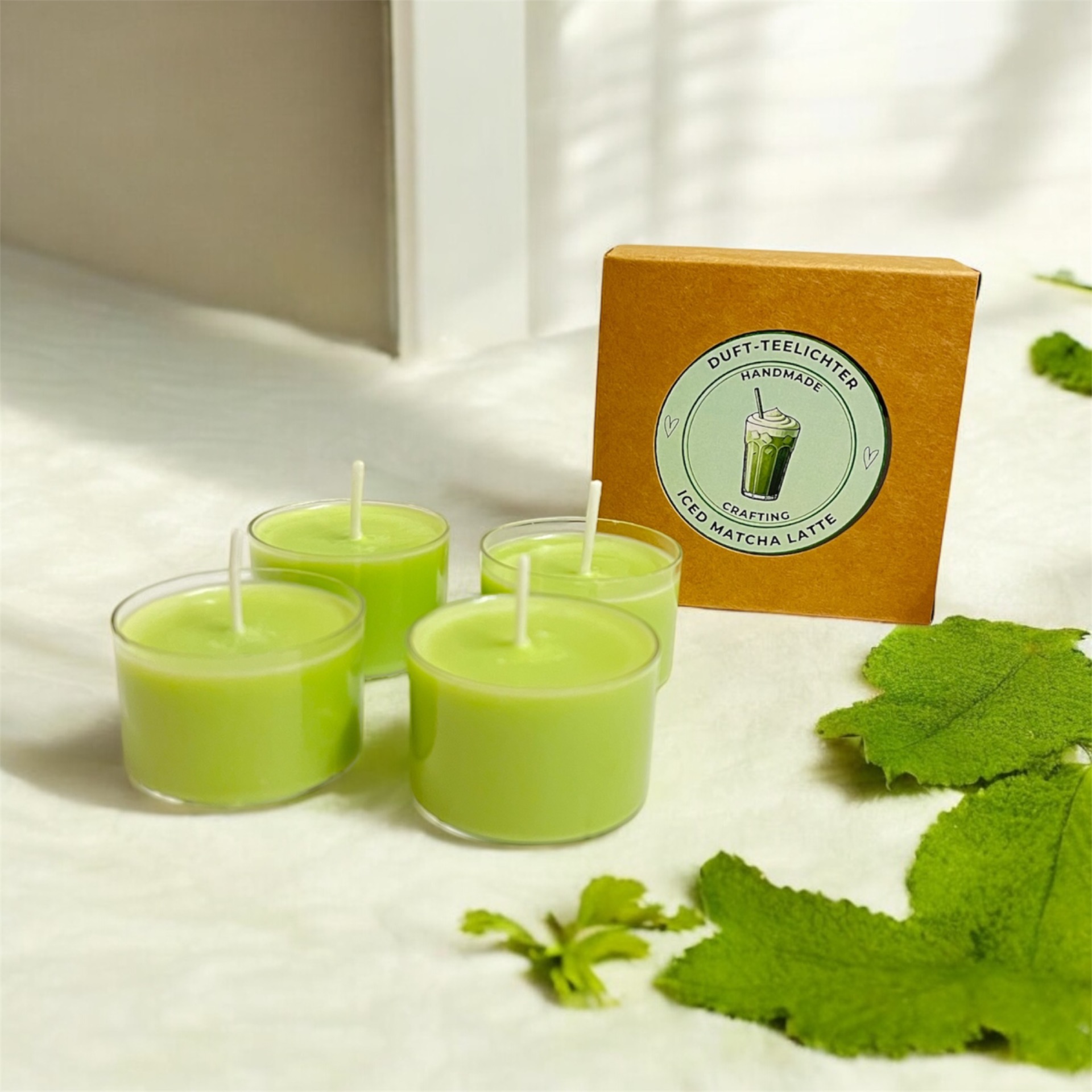 Genieße eine entspannte Atmosphäre mit diesen 4 Duft-Teelichtern. Der erfrischende Duft von Iced Matcha Latte erfüllt den Raum und sorgt für ein angenehmes Ambiente. Die Teelichter sind aus natürlichem Sojawachs hergestellt und haben eine schöne grüne Farbe.